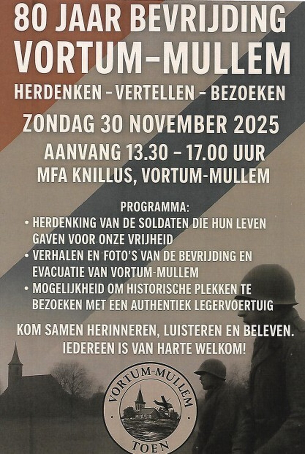 VORTUM–MULLEM – De heemkundegroep Vortum-Mullem-toen organiseert op zondag 30 november van 13.30 tot 17.00 uur in Knillus een bijzondere herdenking van 80 jaar vrijheid. Een waardevol moment om samen stil te staan bij het verleden – zeker in deze tijd, waarin vrede niet langer vanzelfsprekend is.