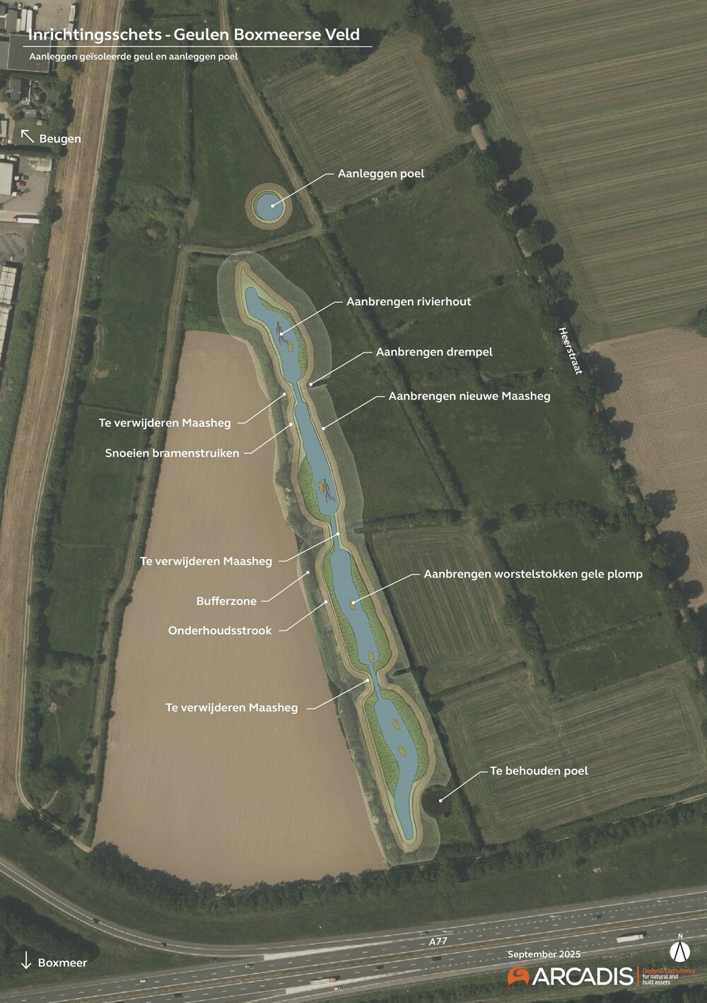 Bij de natuurgeul Boxmeerse Veld wordt het ontwerp minder diep uitgevoerd dan eerder gepland. De geul wordt aangelegd tot aan de kleilaag in de bodem, in plaats van de dieper gelegen zandlaag. Klei laat weinig water door, wat het risico op verdroging van aangrenzende gronden verkleint. Daarnaast wordt de geul smaller vormgegeven, zodat bestaande Maasheggen zoveel mogelijk behouden blijven.