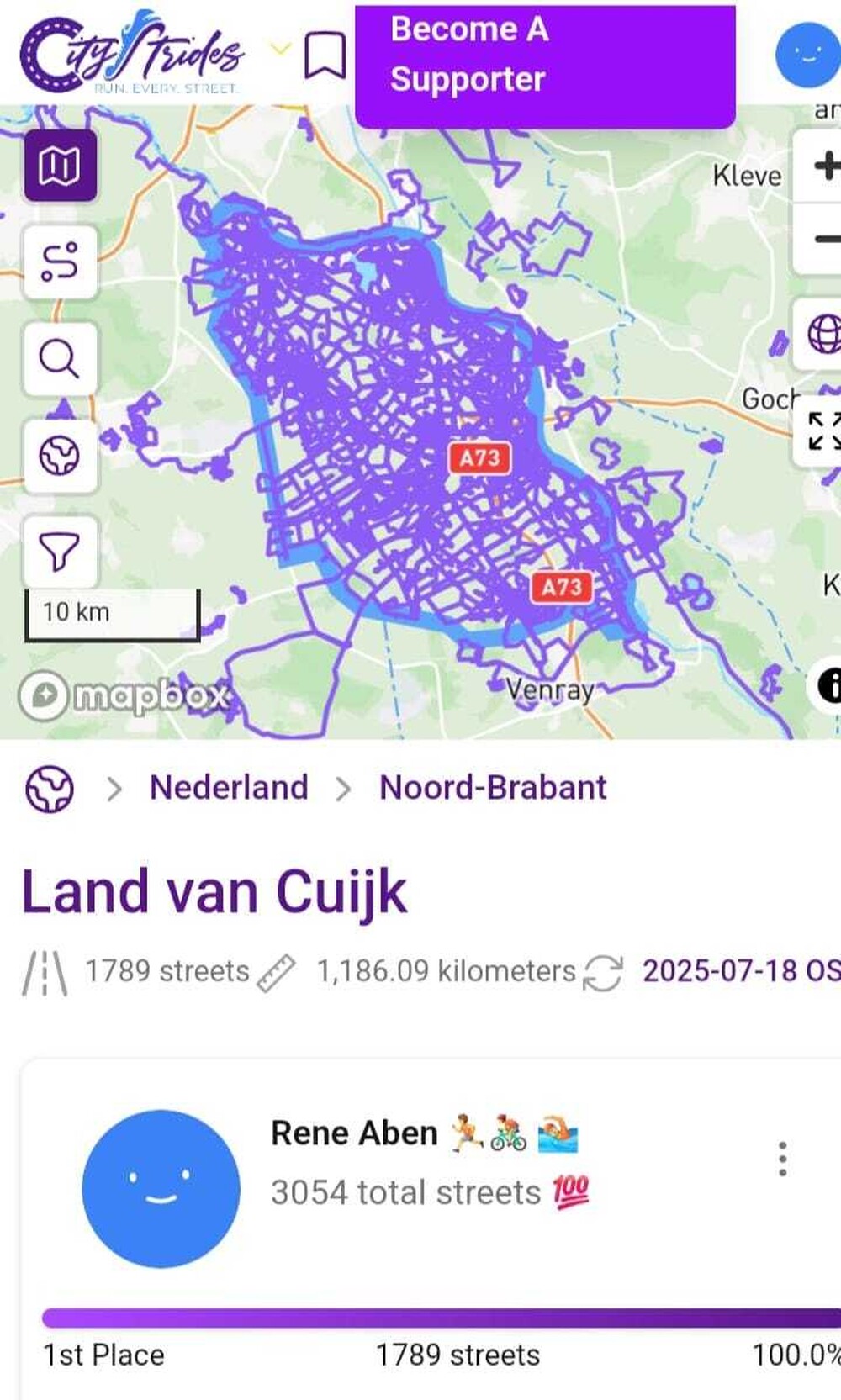 LAND VAN CUIJK – De 54-jarige René Aben uit Rijkevoort heeft álle straten in het Land van Cuijk hardlopend afgelegd. In totaal deed hij daar zo’n zeven jaar over. Deze woensdagmiddag rondde hij zijn missie af. De hardloper hield zijn voortgang bij met CityStrides, een app die speciaal is gemaakt voor hardlopers die een bepaald gebied helemaal willen afleggen.