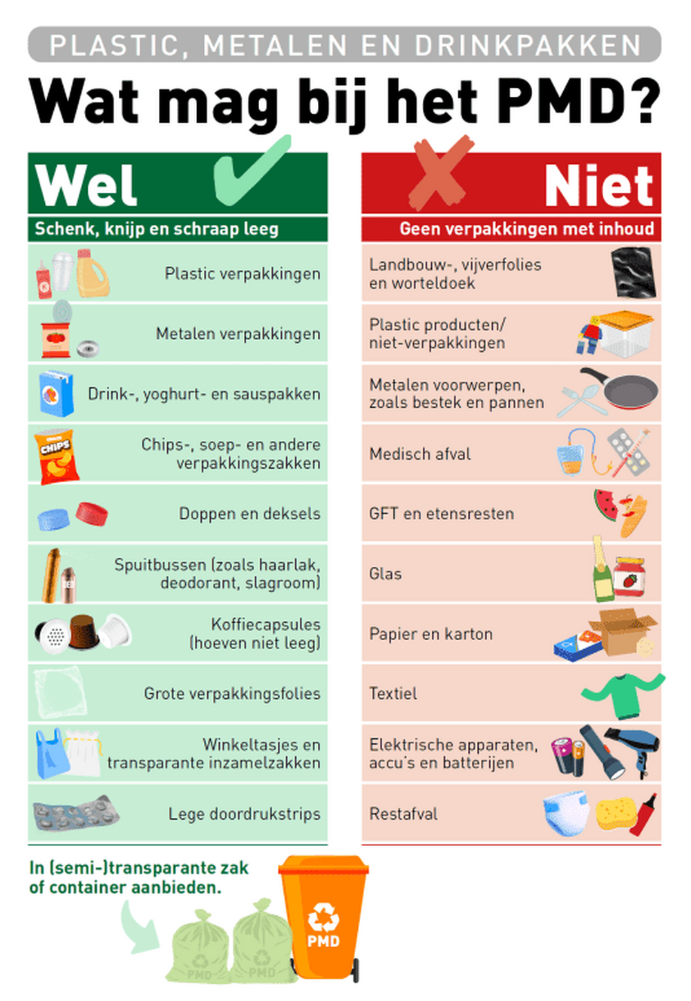 In Nederland wordt PMD-afval op verschillende manieren ingezameld. In de meeste gemeenten gebeurt dit via bronscheiding, waarbij inwoners PMD apart aanbieden in een bak of zak. In een kleiner aantal gemeenten wordt gebruikgemaakt van nascheiding, waarbij recyclebare materialen achteraf uit het restafval worden gehaald. Sommige gemeenten combineren beide systemen. De vernieuwde Wel/Niet-lijst geldt voor alle vormen van inzameling.